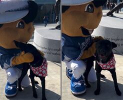 譲渡会で1匹だけ残ってしまった犬、ドジャースのマスコットにたっぷりかわいがってもらう