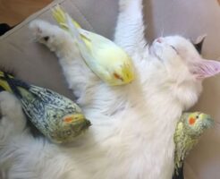 Youtube 猫のもふもふは気持ちがいい。鳥たちにとっては快適な巣なのかもしれない。3羽のオカメインコたちは猫が寝ていると近くに寄ってて猫のもふもふの感触を楽しんでいるようだ。 それは彼らにとって心地の良い巣のよう・・・