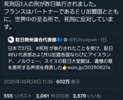 1 名前::2025/06/28(土) 19:39:23.73 ID:bbBzJc4g0.net 死刑囚1人の刑が昨日執行されました。フランスはパートナーであるEU加盟国とともに、世界中の至る所で、死刑に反対しています。・・・