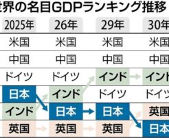 1: それでも動く名無し 2025/10/16(木) 21:46:17.01 ID:nsWU0O9IM 日本のGDP、26年にインド・30年はイギリスに抜かれる見通し…既にドイツに抜かれ4位に転落 https://www・・・