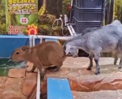 グイグイいきます!子ヤギがカピバラの子に頭突きラッシュ。これも1種のスキンシップ