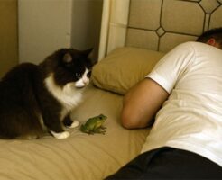 猫が飼い主の枕元に生きたカエルをプレゼント。飼い主の反応は?