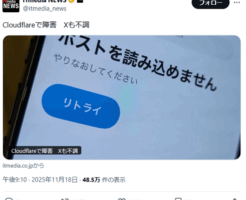 【通信障害】Cloudflareで障害 Xも不調 5ちゃん