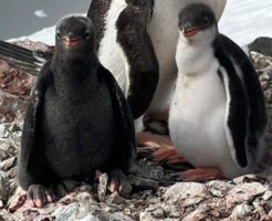 黒かわいい、ジェンツーペンギンのヒナの珍しい黒変種を南極で発見