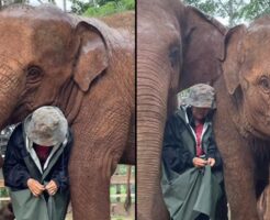 @lek_chailert タイにある象の保護施設で心温まる光景が展開されていた。創業者であり飼育スタッフのレック・チャイラートさんを雨から守るように、2頭の象が体を寄せ合いながら取り囲んでいたのだ。 激しい雨が降り・・・