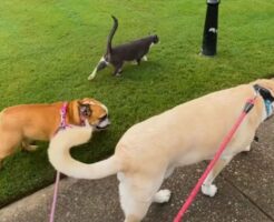 TikTok/englishbulldog_emmie アメリカ、、ジョージア州で暮らすヒラリーさんは毎朝2匹の愛犬を連れて散歩に出かけるのだが、なぜかいつも1匹増えている。近所に住む猫が、散歩に加わるのが日課になって・・・