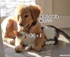 ヘッドロック決めたぜ!ゴールデンレトリバーの子と猫が仲良くプロレスごっこ