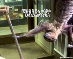 アメリカ、ミネソタ州にある動物と触れ合えるサステナブル・サファリで飼育されている、フタユビナマケモノのジェニファー・スローペズは、お掃除のお手伝いをしてくれる親切なナマケモノだ。 逆さまにぶら下がった状態で、柄の長い・・・