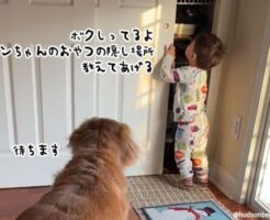 ボク知ってるよ。大親友の犬に犬用おやつの隠し場所を教えてあげた2歳の男の子