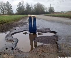 「水がたまった状態の道路の穴になんか出てる!逆さまになった人間の足が出てる!」だが緊急通報するのはちょっと待ってほしい。実はこれ、ある種の抗議行動なのだ。 イギリスで、道路の穴がいつまでたっても修理されないことに嫌気・・・