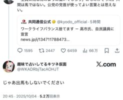 1 :それでも動く名無し:2025/10/04(土) 20:26:19.53 ID:TgNwfzYJ0.net 高市氏の「WLB捨てる」発言 過労死遺族は驚き「影響力考えて」 https://t.co/3PlxvEGU4・・・