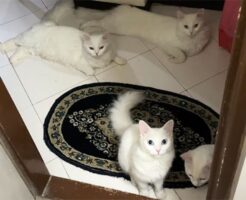 こんな動画だけ見ていたい。バスルームに入るとドアの前で待ち続ける5匹の白猫