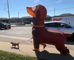 tiktok.com/@undercoverdachshund カナダのオンタリオ州で、ダックスフントの着ぐるみを着た男性が、愛犬のダックスフントと一緒に散歩をするというユニークな日課を続けている。 その微笑ましい姿は・・・