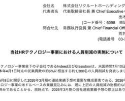 1: 2025/10/05(日) 15:12:44.36 当社のHRテクノロジー事業傘下の子会社であるIndeed及びGlassdoorは、米国時間7月10日、同事業セグメントの本年4月1日時点の従業員数の約6%に相当す・・・