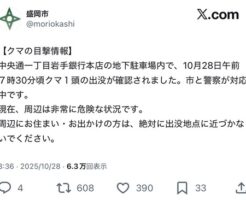 【悲報】岩手銀行本店地下駐車場にクマが侵入し現在立てこもり中!!!!!!!!!!