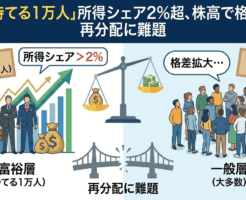 1: 2026/01/03(土) 17:14:09.32 ID:X8XrXP349 日本で株高を要因とした経済格差が広がっている。人口およそ1万人に相当する上位0.01%層の所得全体に占める割合は、初めて2%超に達した。・・・